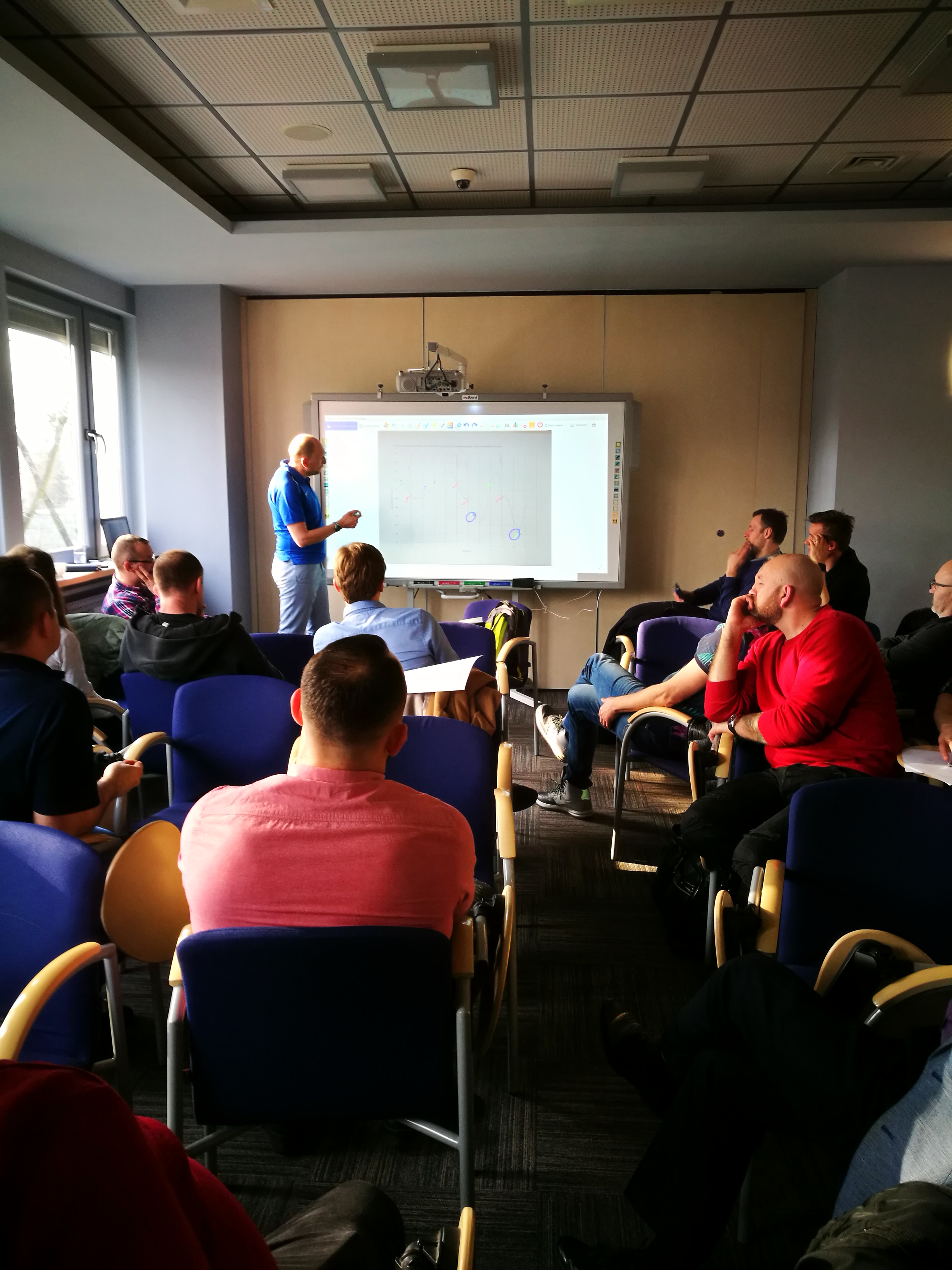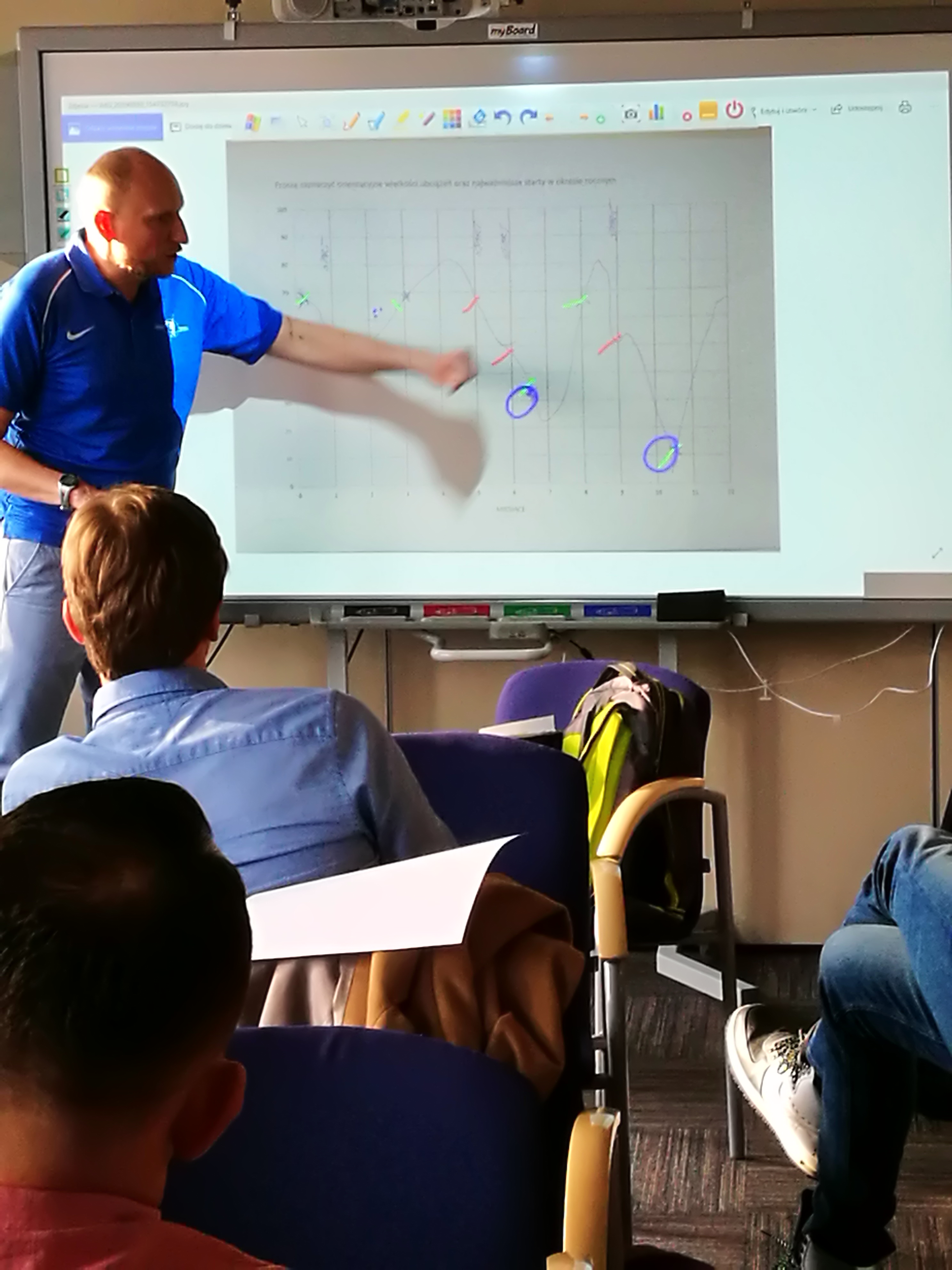 Podczas warsztatów dr. Konradem Witkiem (Zakład Biochemii IS-PIB) na tablicy multimedialnej trenerzy planowali ćwiczebnie badania biochemiczne w cyklu treningowym w swoich dyscyplinach.